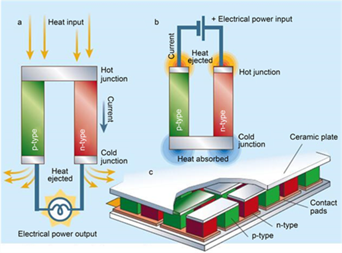 半導體熱電技術主要包括半導體熱電制冷技術和溫差發電技術兩個應用方向,分別利用半導體材料的帕爾貼效應(Peltier effect)和塞貝克效應(Seebeck effect),實現了電能和熱能之間的相互轉換,是一種環保型制冷技術和綠色能源技術。
