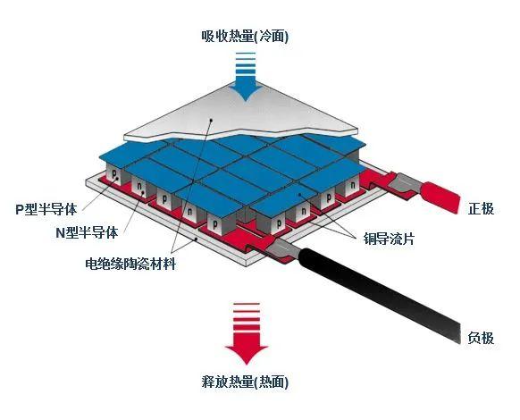目前,普遍商業化的半導體制冷片以碲化鉍基為主(碲化鉍為基材,做不同的摻雜形成P級和N級),帕爾帖效應更明顯,相應的制冷效率更高。